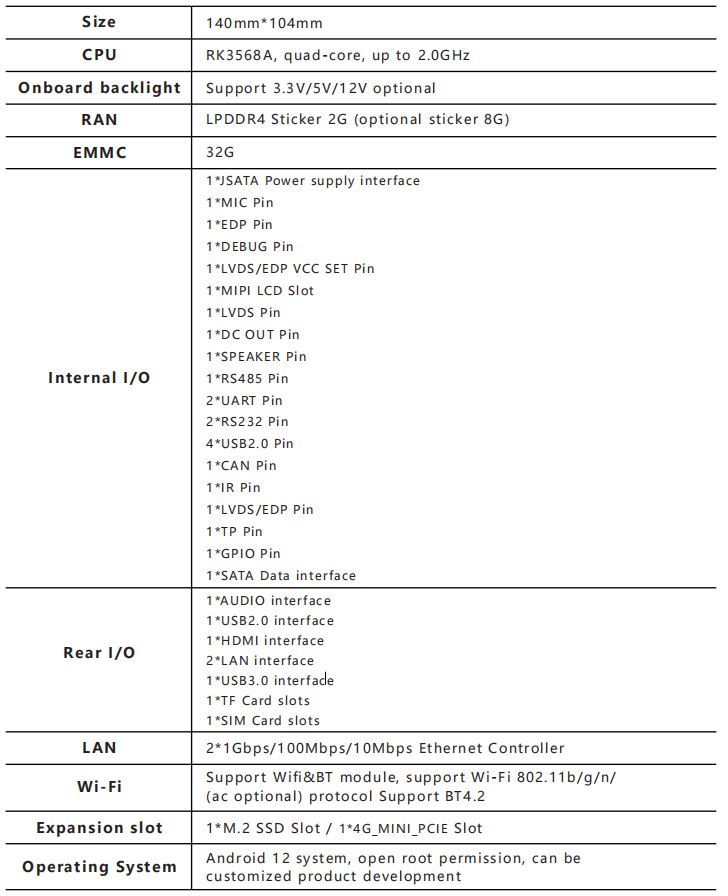 -Support 2*LAN (1Gbps/100Mbps/10Mbps Ethernet Controller) Support Wifi&BT module, support Wi-Fi 802.11 b/g/n (ac optional) protocol Support BT4.2
