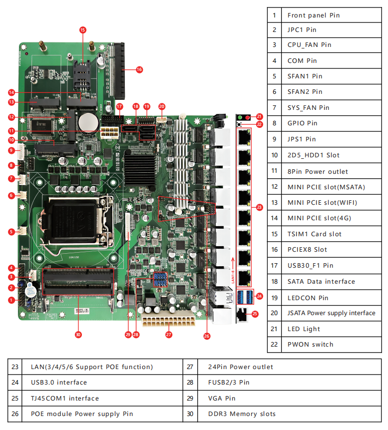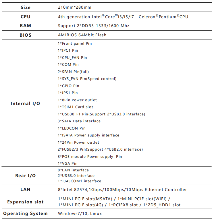 Support 8*LAN(Intel 82574,1Gbps/100Mbps/