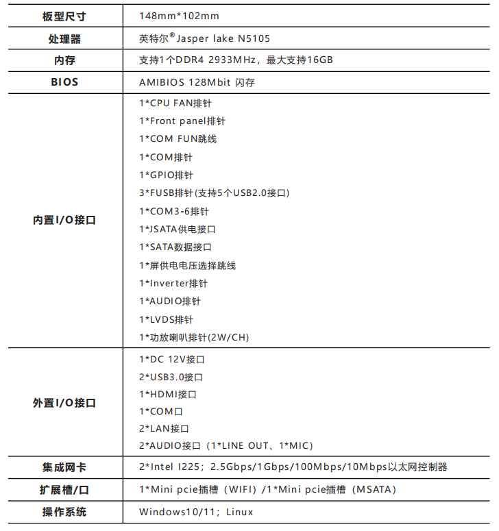 - 支持2个LAN口(Intel I225;2.5Gbps/1Gbps/100Mbps以太网控制器)