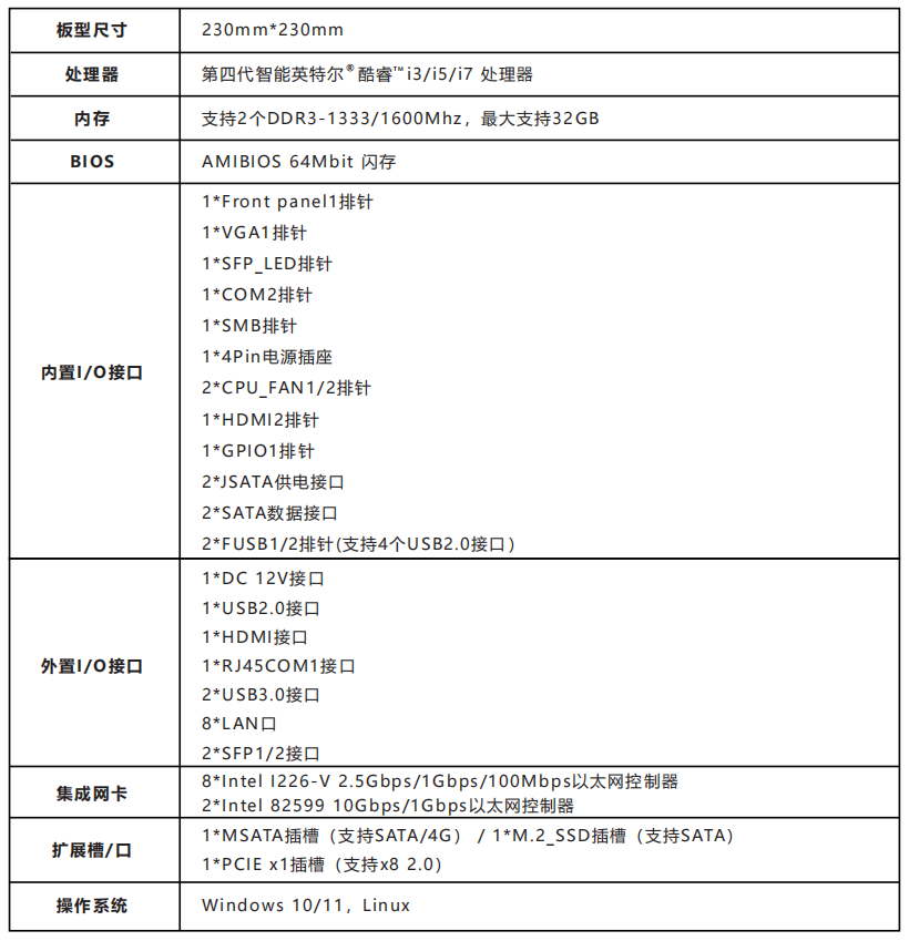应用需求。板载2条DDR3内存插槽,最大支持32GB内存容量。支持8路RJ45千